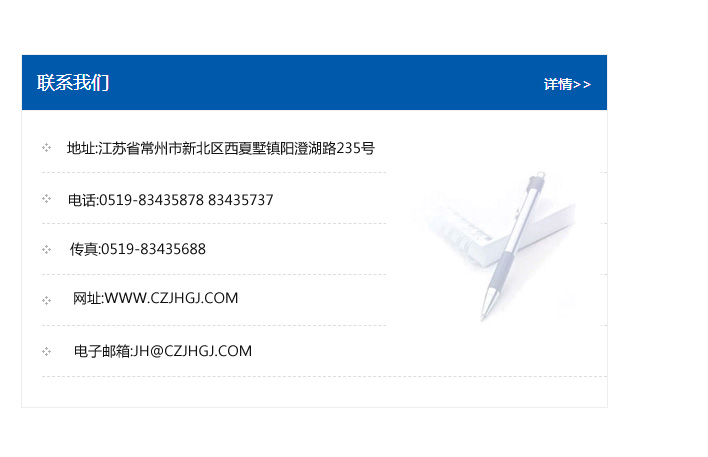 地址:常州市新北區友邦商務大廈1幢16、17層  電話:0519-85101652  傳真:0519-85112595  郵編:213022  網址:www.cz-jiayue_cn.ooali.com  郵箱:xiajifengaa@163.com